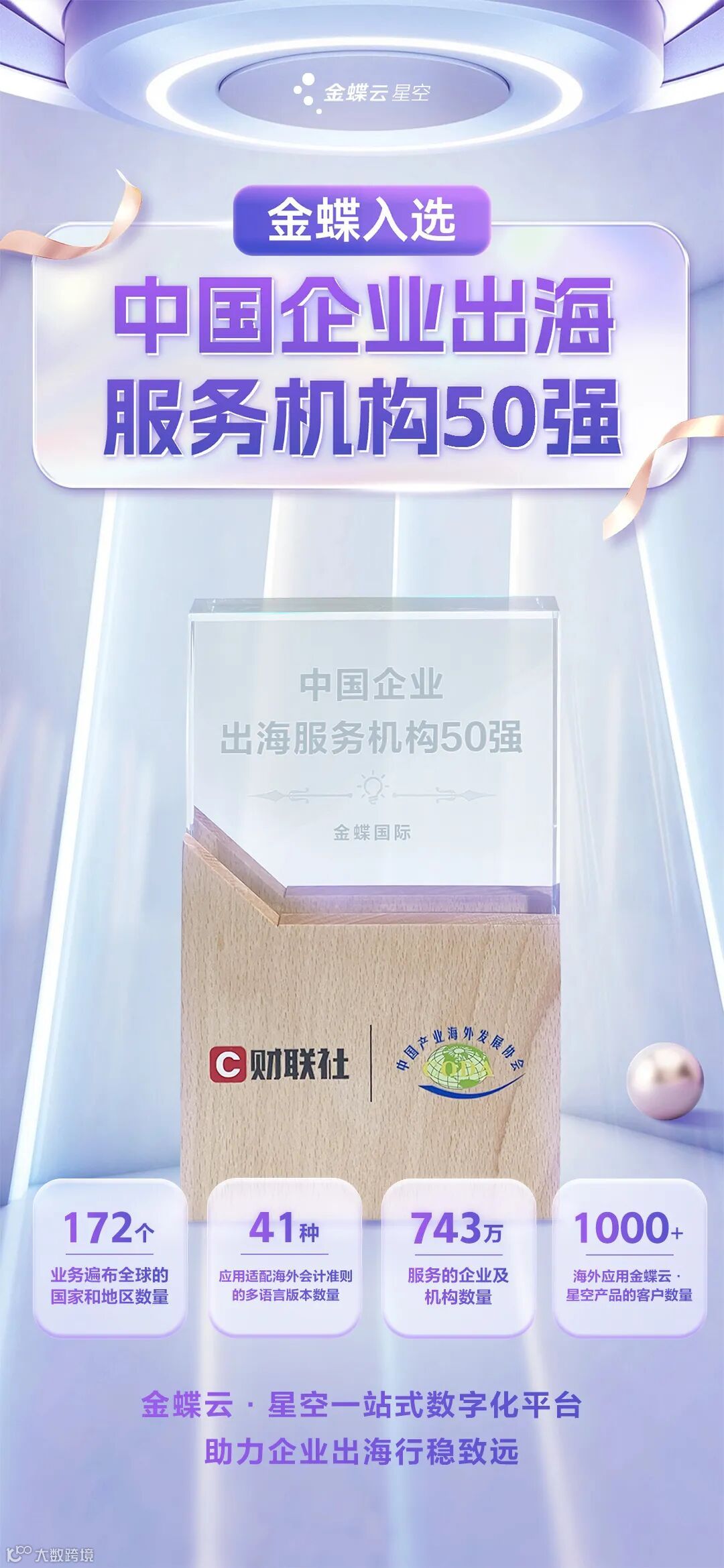 近日,在北京国家会议中心举行的第十四届中国对外投资合作洽谈会的颁奖晚宴上,由财联社与中国产业海外发展协会(中海协)联合评选的“中国企业出海服务机构50强”正式发布。金蝶凭借其31年企业服务实践,为出海企业提供国际化平台技术支撑以及一体化SaaS解决方案等优势,入选50强榜单。