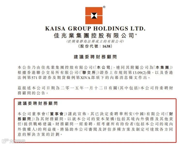 2015年2月,佳兆业发布重组及再融资方案,聘任华利安协助制定境内外债务重组方案。