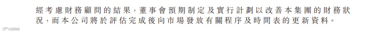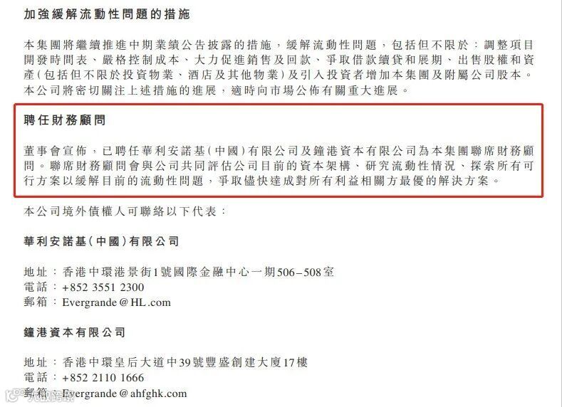 此外,为了进一步改善流动性问题和化解当下的债务危机,恒大已经聘请华利安诺基(中国)有限公司及钟港资本为联席财务顾问,和公司共同评估目前的资本架构、研究流动性情况、探索所有可行方案,以缓解流动性问题。