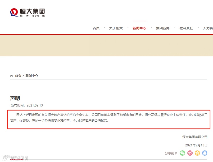 9月13日晚间,恒大在官网声明中称,网络上出现的有关恒大破产重组言论完全失实,目前确实遇到了前所未有的困难,但公司全力以赴复工复产,保交楼,想尽一切办法恢复正常经营。