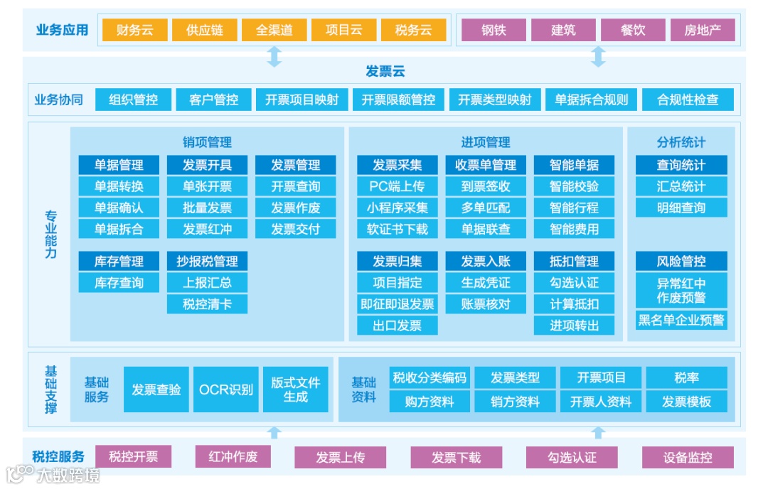 税务管理的系统架构除了满足不同的行业,还可以满足多场景的需求,以及专业的管理,还有标准化的配置,以及其他的税控服务。