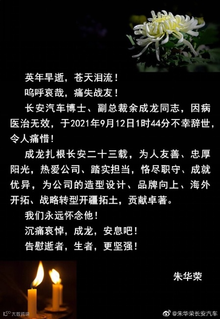 长安汽车董事长朱华荣在微博发文悼念