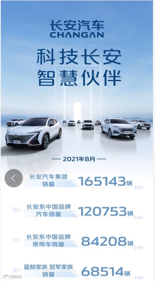 9月8日晚,长安汽车公告披露产、销快报的自愿性信息。数据显示,8月长安汽车整体销售165143辆。尽管国内汽车市场受芯片短缺、疫情等因素影响,已连续三个月销量下滑,但长安汽车1-8月累计销售1543931辆、同比增长32.5%,长安汽车推出的CS系列、逸动系列、UNI系列在市场中均有优秀的表现,今年整体销量一举突破150万辆大关。