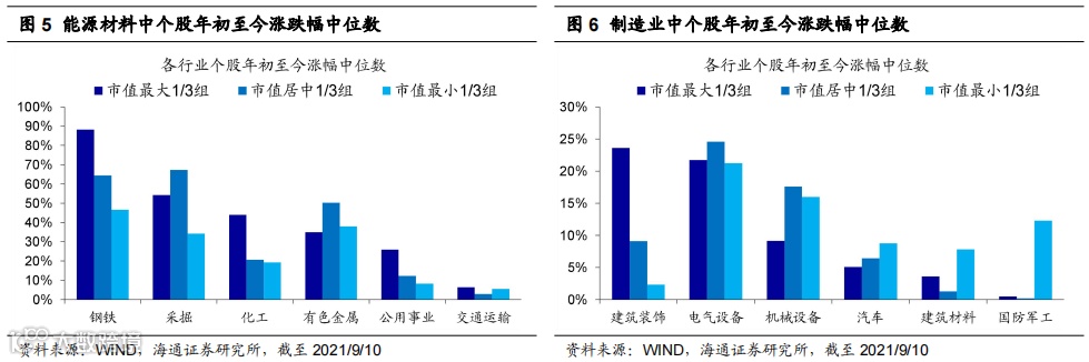②制造业整体偏中小市值风格,6个子行业中建筑装饰大市值占优,电气设备、机械设备中市值占优,汽车、建材和军工则是小市值占优。