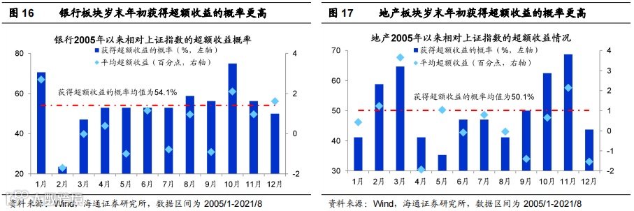 三是冷门行业中的金融地产。在《冷门行业里淘宝-20210901》中,提到目前市场冷门行业有很多,结合市场面(涨跌幅、基金持仓、交易热度、估值)、基本面(ROE、净利润同比)和催化剂,我们认为最值得重视的是券商(市场成交量放大)和银行地产(政策宽松及年末效应)。券商行业贝塔属性明显,行业崛起往往与市场情绪走高同步,带动宽基指数向上突破。2019、2020年券商净利润同比分别为75%、36%,对应券商指数全年最大涨幅为56%、55%,而今年上半年券商净利润累计同比为27%,指数年初至今仅上涨1%,所以我们认为在当前成交量持续放大背景下券商有望迎来上涨。地产正处于政策筑底中,一方面地产债务问题正在平稳过渡,另一方面地产土地出让政策限制溢价率,有望稳定开发商利润,地产估值有望修复。另外,目前银行估值较低,宏观政策基调转向提振市场对未来经济基本面的信心,缓解对银行坏账的担忧,银行板块将获得估值修复的动力。此外,岁末年初异动概率大,前期涨跌幅靠后的地产和银行板块或将受到更多关注。