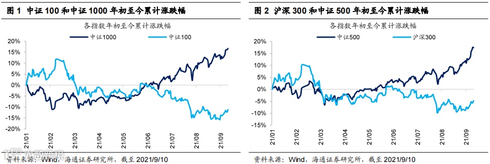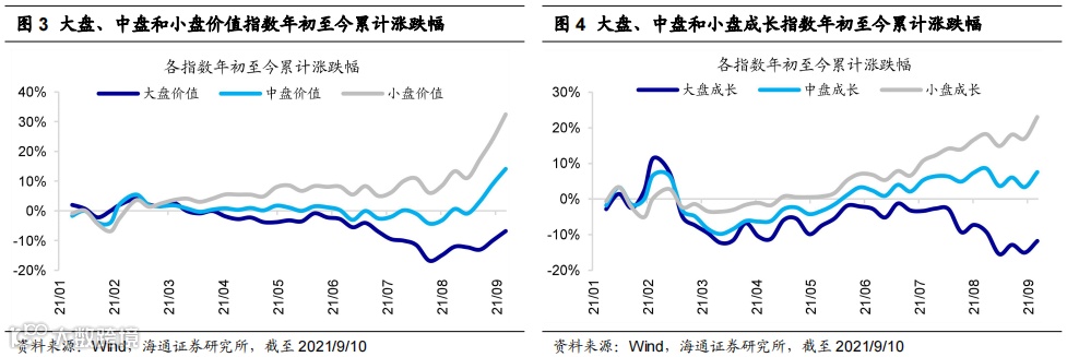 各类市值风格指数显示今年“大盘”明显跑输“小盘”。今年以来投资者对市值风格探讨较多,从各类市值指数看,年初至今(截止至2021/9/10,下同)上证50/中证100/沪深300指数这些传统上被视作“大盘股”的指数涨跌幅分别为-12%/-12%/+1%,而中证500/中证1000/国证2000等“小盘股”指数的涨跌幅分别为+13%/+14%/+19%,指数走势出现明显分化意味着今年市值风格出现了明显的分化。如果用划分相对更加细致的巨潮指数来衡量,年初至今巨潮大盘价值/中盘价值/小盘价值涨跌幅分别为-7%/+13%/+24%,大盘成长/中盘成长/小盘成长涨跌幅分别为-7%/+9%/+20%,大盘类指数明显跑输中小盘类。时间看的更短一些,7月后大小盘风格的差距进一步拉大,以价值股为例,7月至今大盘价值/中盘价值/小盘价值涨跌幅分别为-3%/+11%/+18%。