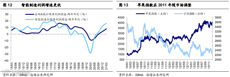 一是硬科技维持涨势。今年3月下旬开始到5月下旬我们撰写了《中国智造系列报告1-5》,一直坚定看好科技赋能的智能制造,也就是硬科技行业,这些行业基本面较好,股价表现强劲,基本已经得到市场认可。比如,1-8月新能源汽车批发和零售销量累计同比分别为225%和202%,21Q2新能车指数净利累计同比为102%,今年以来涨幅为35.4%。目前硬科技的智能制造景气度高已经成为市场共识,主要的焦点是如何看待高估值。而在《借鉴智能手机看新能源车产业演变-20210906》中我们指出,今年新能源车产业链类似2010年苹果手机产业链,高景气、高估值,未来几年有望维持高景气,阶段性消化估值需要等市场环境改变。