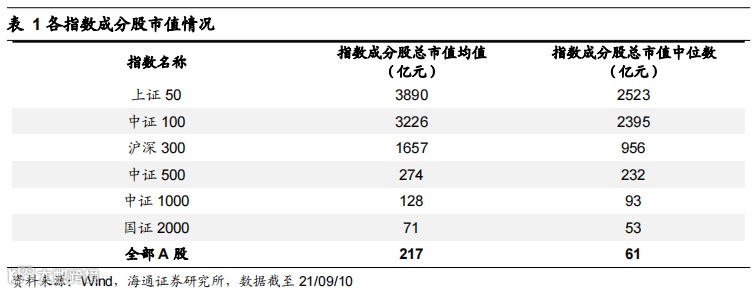 “大”和“小”是相对概念,今年市值TOP1/3个股仅略跑输后1/3个股。十年前,大家用沪深300来代表大盘股以及用中证500来代表小盘股具备一定的合理性,因为2010年A股上市公司一共有约1600家,沪深300大致代表着市值最大的前20%个股,中证500代表市值在中间30%的个股,中证500的市值相对沪深300的确小一些,那时中证1000尚未诞生,因此中证500的确可以被称作小盘股。2014年中证1000出现,14年时全部A股共约2500只个股,中证1000代表全A剔除中证800之后剩下个股中市值最大的1000只个股,按市值由高到低分位数来计算,中证1000代表着市值top30-70%这一档。时过境迁,今天A股上市公司已经接近4500家,沪深300已然成为超大盘股,代表着市值top0-7%这一档,而中证500代表7-18%这一档,其实已经变成大盘的指数了。中证1000代表着18-45%这一档,算是中盘股指数。只有国证2000勉强可以算小盘股指数,它代表市值top22-67%这一档,类似14年中证1000的地位。我们将目前全部A股按照总市值从大到小排序,位于33%分位数的公司总市值为110亿,位于67%分位数的公司总市值45亿,而中证500成分股平均市值270亿,中证1000成分股130亿,国证2000则为71亿。年初A股市值最大的1/3的公司至今股价平均涨跌幅为18%,中间1/3为21%,末位1/3为22%,因此今年大盘股其实没跑输小盘股多少。