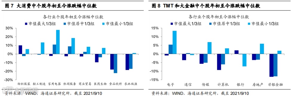 ③大消费整体偏小市值风格,8个子行业中仅纺织服装大市值占优。