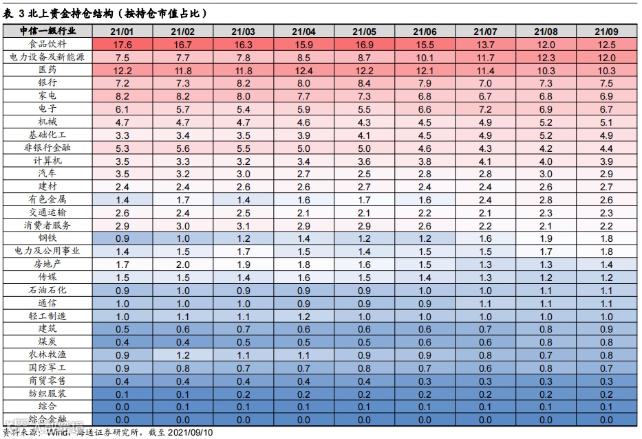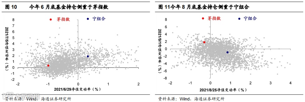 当前市场高成交额背后是机构逐步完成调仓,未来单日成交额有望更高。7月以来市场单日成交额破万亿已成常态,同时增量资金也在不断进场,我们测算得出今年1-8月超1.4万亿资金净流入股市,其中7-8月的净流入接近3000亿元。然而在成交额放大、增量资金持续入场的背景下市场主要宽基指数却基本走平。我们在《携手迈向新高度-20210905》中分析过,这一现象的背后其实是公募基金和外资在逐步完成调仓,使得市场上行业间的分化程度较大。以公募基金为例,根据主动偏股型基金的净值涨跌幅散点图,可以发现6月底基金涨跌幅的散点分布在“茅指数”附近,而8月则向“宁组合”附近迁移,即公募基金净值涨跌幅与“宁组合”涨跌幅趋势相对更加一致。外资方面,从持仓占比来看,年初至今(截至2021/09/10,下同)食品饮料、家电等在外资持仓中占比持续下降,而新能源车相关行业占比上升。其中食品饮料在外资持仓中的占比从17.6%下降至目前的12.5%,家电从8.2%下降至6.9%,电力设备及新能源从7.5%上升至12.0%,基础化工从3.3%上升至4.9%;有色金属从1.4%上升至2.6%。