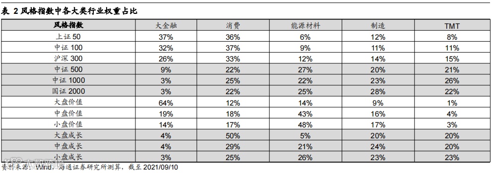 指数分化的背后是行业的分化。如果我们仔细拆解各类市值风格指数的成分股,我们可以发现指数分化背后实质是行业的分化。我们计算各个指数中目前(截止2021/09/10,下同)大类行业的权重占比,可以发现上证50、沪深300等指数在行业构成上更加偏向大金融和大消费,而中证500、中证1000等指数在行业组成上更偏向能源材料、制造和TMT行业,比如沪深300指数中金融和消费的权重占比接近60%,能源材料和制造占比只有26%,而中证500中金融消费占比只有约30%,能源材料和制造的占比则接近50%;又比如,大盘成长指数中消费一个行业占比就超过了50%,而能源材料占比只有5%,小盘成长的占比则均衡一些,消费和能源材料占比均为25%左右。回顾今年以来申万一级行业的表现,可以发现至今跌幅较大的行业均集中在大金融和大消费中,年初至今食品饮料、家电、农林牧渔等行业跌幅约为20%,非银金融和地产下跌约10%,而同期能源材料中的钢铁、采掘、化工、有色等行业涨幅均超过了50%,制造业中的电气设备涨幅超过40%。因此,与其说今年小盘股战胜了大盘股,不如说是周期制造业跑赢了消费和金融业。