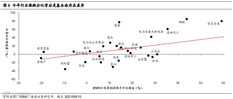 景气度差异为推动行业表现分化的主因。我们在《资源品与科技盈利继续高增——21年中报点评-20210831》测算过今年上半年不同行业归母净利润的两年年化增速,将其与今年的行业涨跌幅进行匹配,可以发现两者之间的相关性较强,即今年行业间的股价表现之所以有分化,究其原因还是行业的景气度存在差异。以新能源车产业链为例,由于今年新能源车产销不断放量,高景气推动下产业链相关行业的业绩增速居于前列,因此行业指数的涨幅也很大,例如有色行业21H1归母净利润两年年化增速为59%,行业指数涨幅为80%、化工行业分别为35%和61%、电新行业为28%和42%。除有色和化工外其他能源材料板块业绩也较好,例如煤炭行业21H1归母净利润两年年化增速为14%,行业指数涨幅为77%,钢铁为44%和85%。相比之下消费板块21H1归母净利润两年年化增速仅为12%,金融地产板块仅-0.3%,业绩增速明显不及周期和制造业,因此行业指数表现也偏弱。