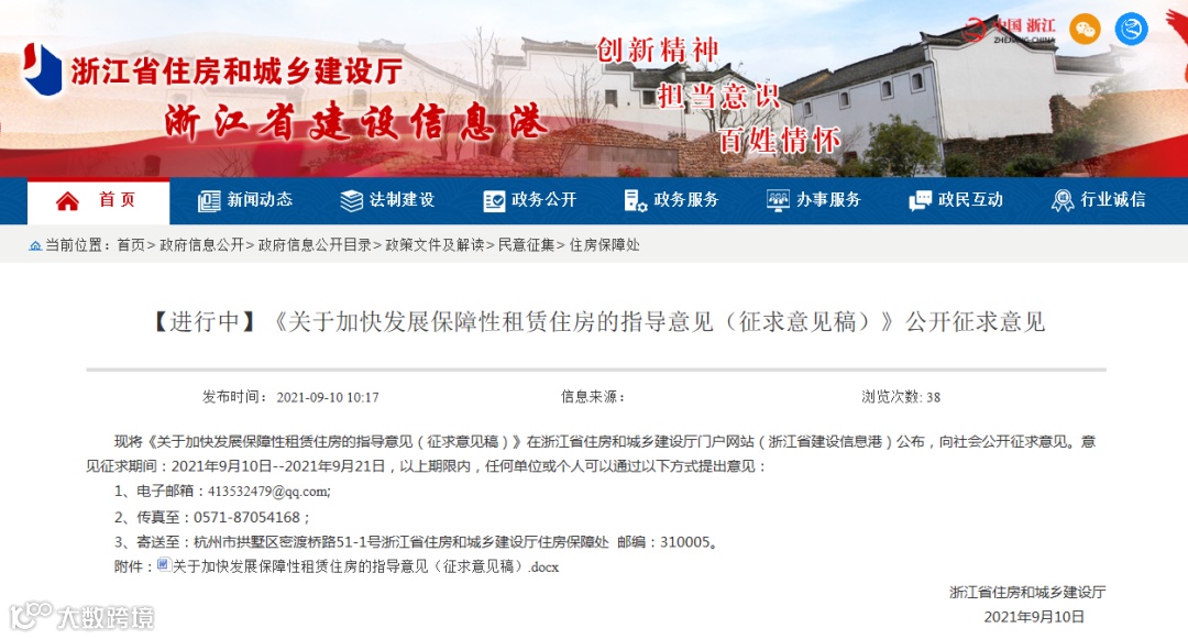 9月10日,浙江省住房和城乡建设厅网站公布《关于加快发展保障性租赁住房的指导意见(征求意见稿)》(下称“指导意见”),并向社会公开征求意见。此次意见征求期间为2021年9月10日--2021年9月21日。