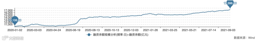 从融资规模变化来看,Wind数据显示,自2020年初以来,A股融资余额逐渐从2020年初的1.01万亿元增长至9月9日的1.74亿元。