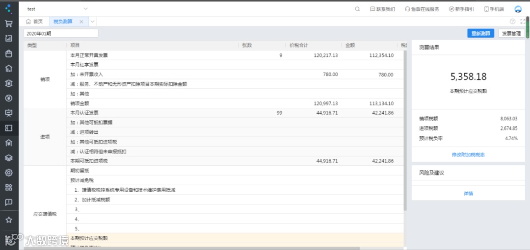 2、用户点击打开“税负测算”界面,选择会计期间,点击重新测算。支持申报项调整,支持附加税测算,风险项提示等。