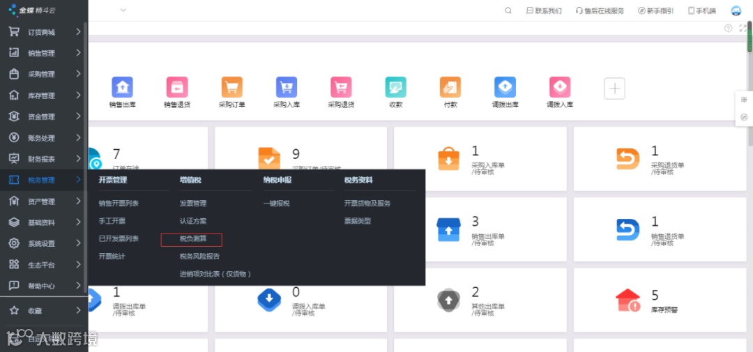 1、用户登录新一代精斗云,点击税务管理,找到“税负测算”。