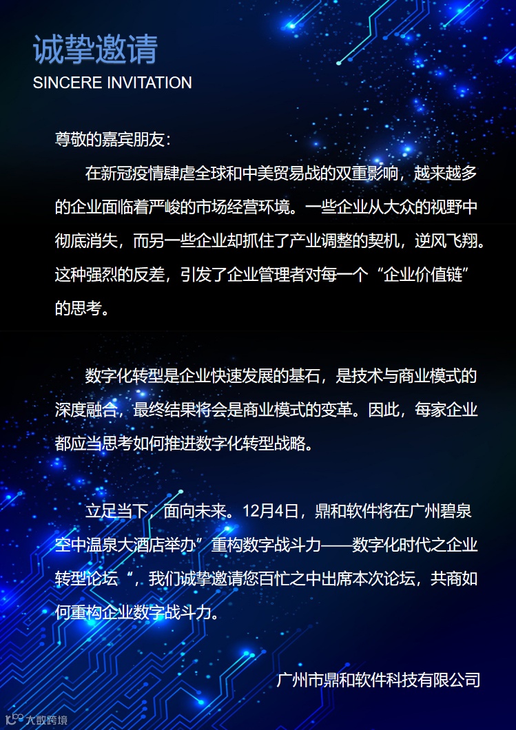 导读:12月4日,鼎和软件将在广州碧泉空中温泉大酒店举办”重构数字战斗力——数字化时代之企业转型论坛“,我们诚挚邀请您百忙之中出席本次论坛,共商如何重构企业数字战斗力。
