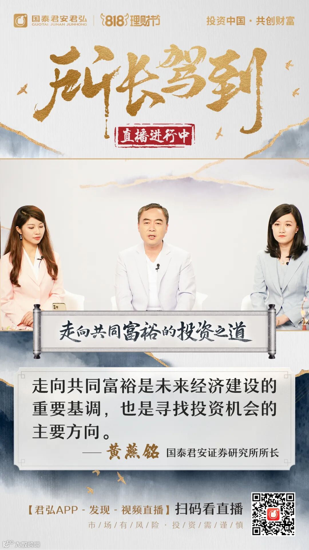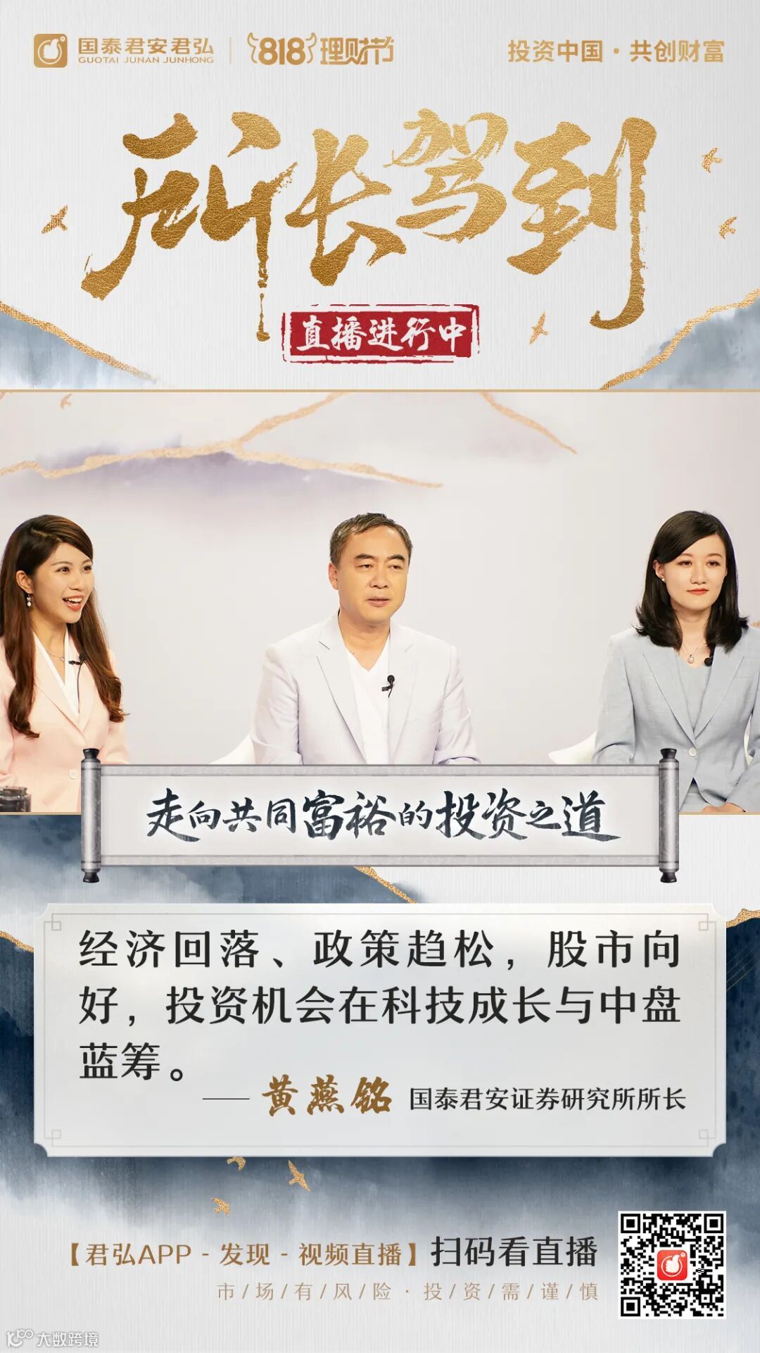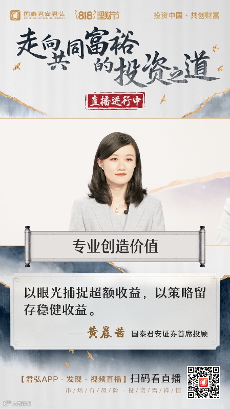 8月18日,国泰君安818理财节迎来重磅直播节目《所长驾到》,国泰君安证券研究所所长黄燕铭携五位首席投顾与投资者共赴一年一度的818理财节之约,在国泰君安司庆夜进一步加强券商原创内容的运营力度,借助818理财节,集聚流量,探索证券机构数字化营销服务新模式。