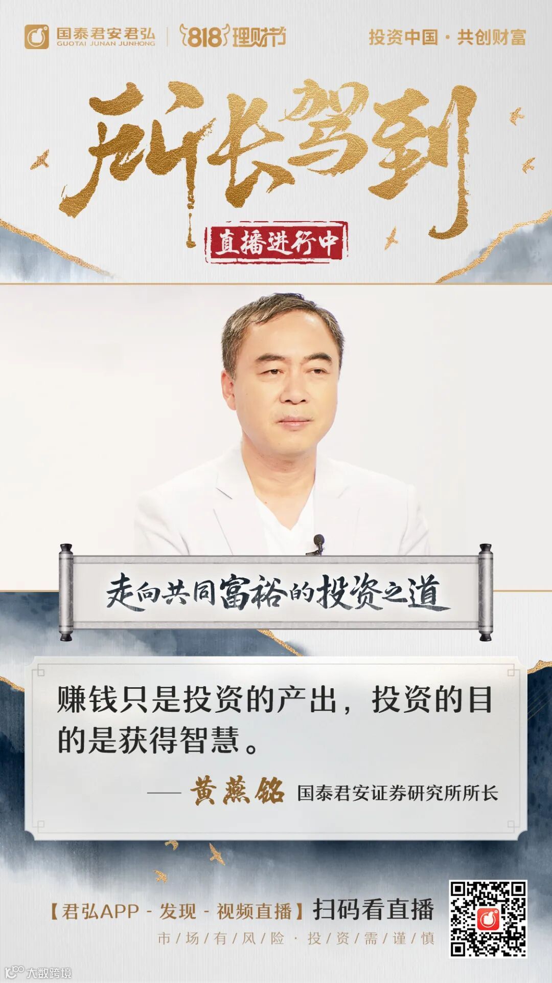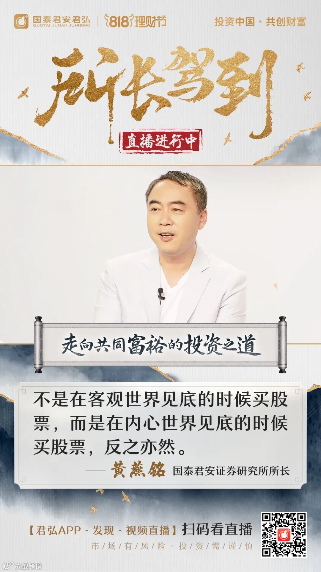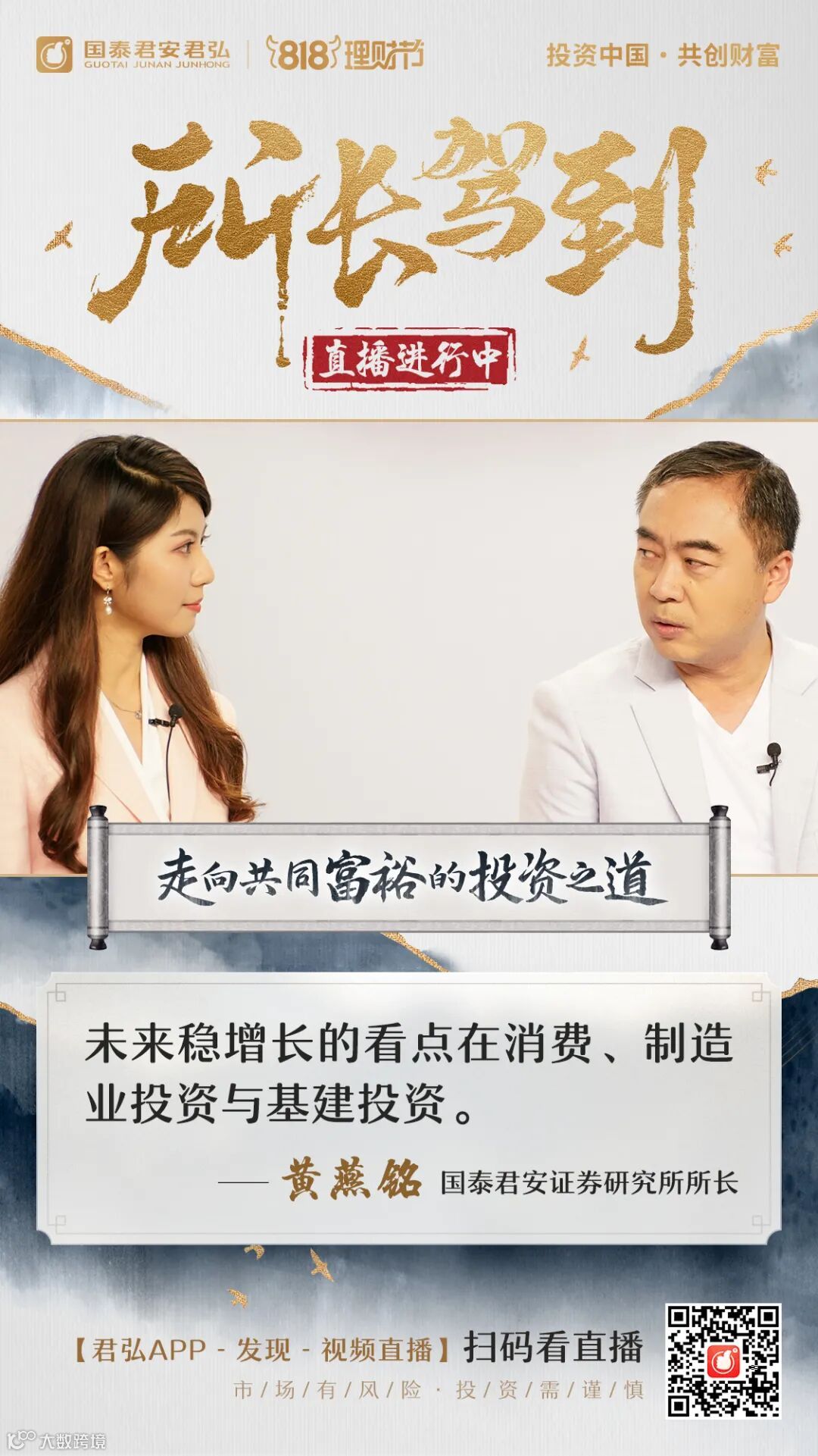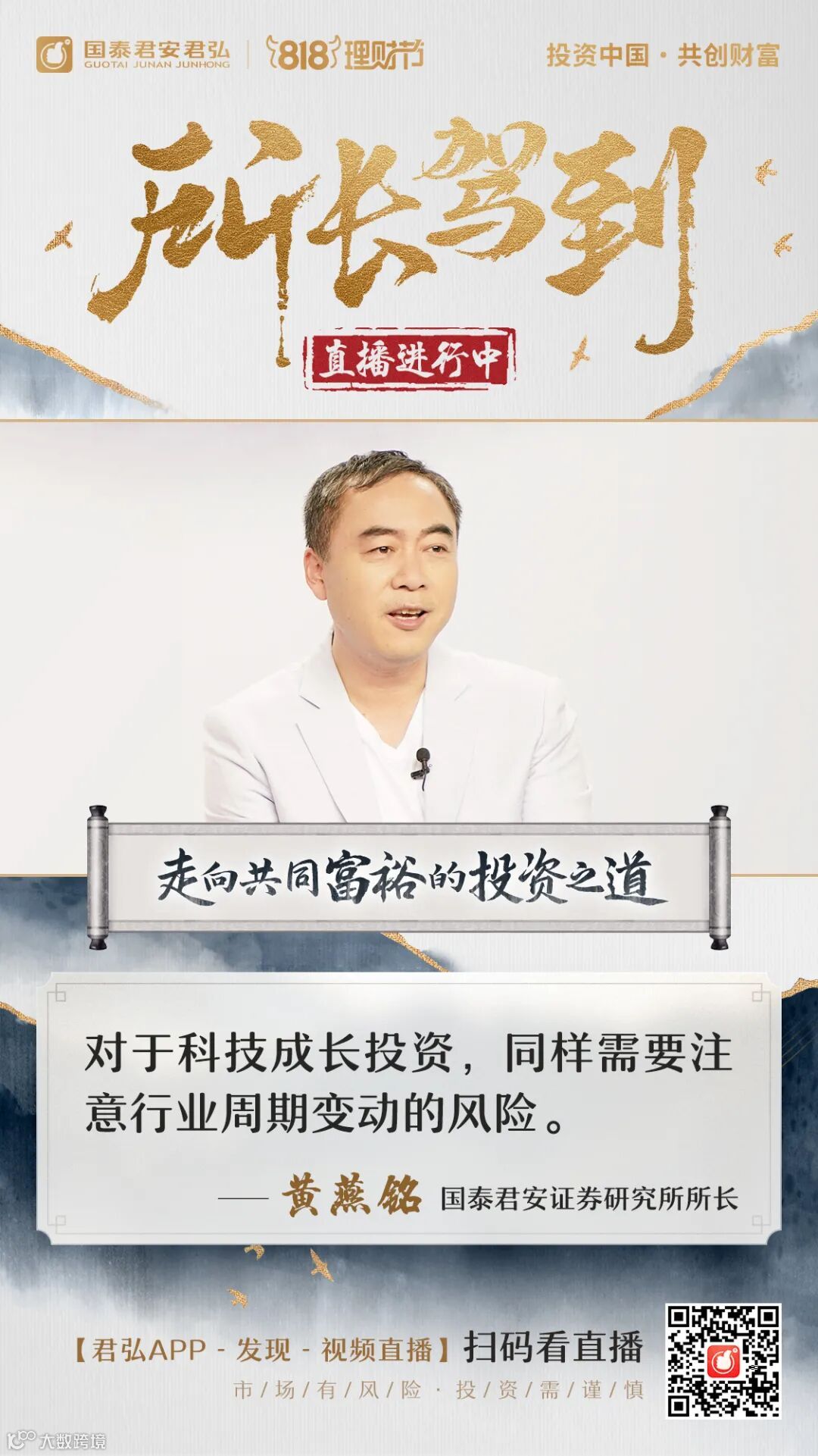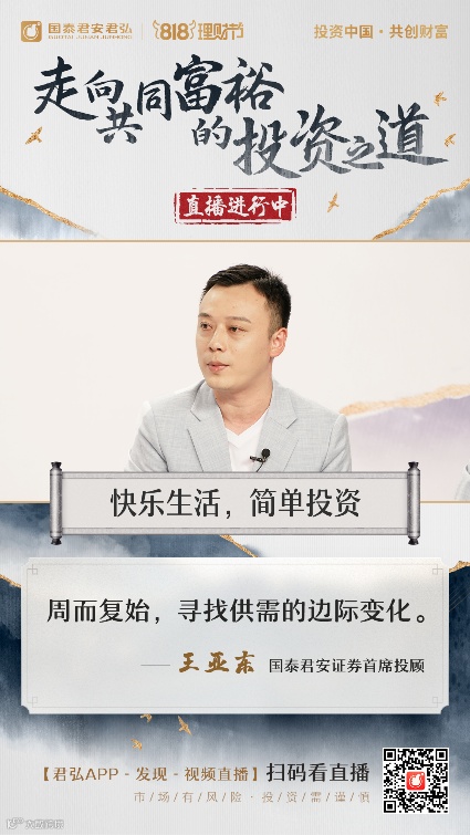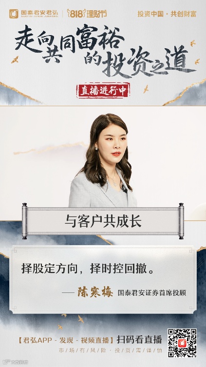 “点亮震撼朋友圈,直播霸屏投资者”,国泰君安财富委主办的818理财节正持续传递“投资中国,共创财富,国泰君安与你相约818”的品牌主张,倡导理性投资、长期投资。