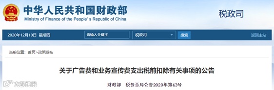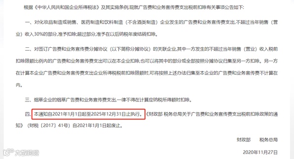 自2021年1月1日起施行。二财政部和税务总局联合发布《关于广告费和业务宣传费支出税前扣除有关事项的公告》