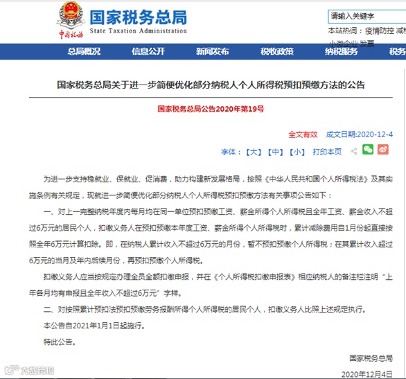 扣缴义务人在计算并预扣本年度1月份个税时,系统会根据上一年度扣缴申报情况,自动汇总并提示可能符合条件的员工名单,扣缴义务人根据实际情况核对、确认后,即可按本《公告》规定的方法预扣预缴个税。
