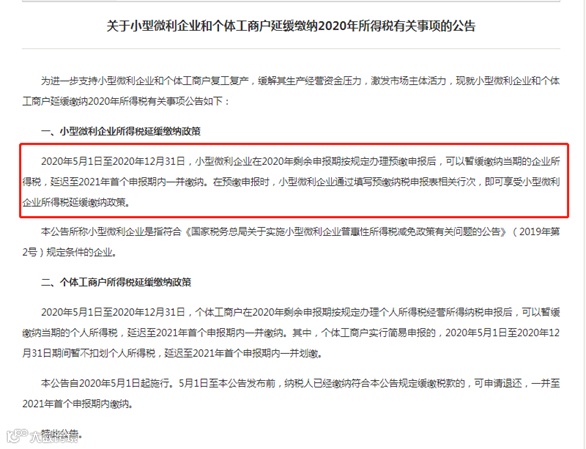 小型微利企业和个体工商户在2020年办理第三、四季度企业所得税预缴申报时,可以只申报不缴税,应缴税款延缓至2021年1月,同2020年第四季度的税款一并缴纳。