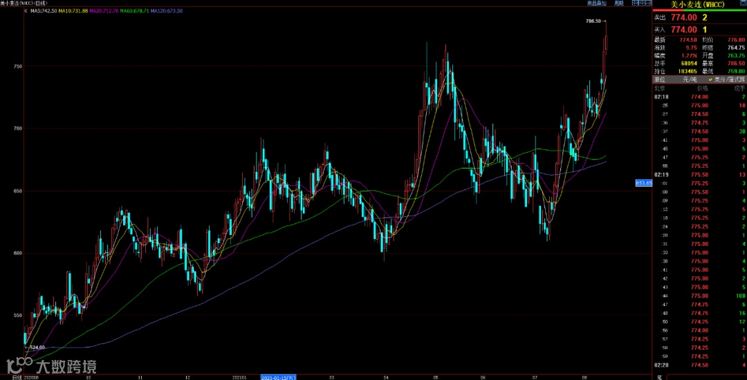 上周五,美国小麦期货主力合约价格8月13日一度突破780美分/蒲式耳,创2013年2月以来新高。巴黎小麦期货价格上周累计上涨近10%,达到2012年以来的最高水平。