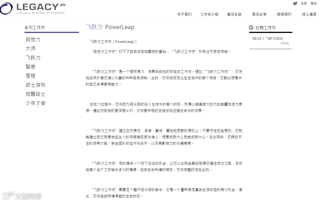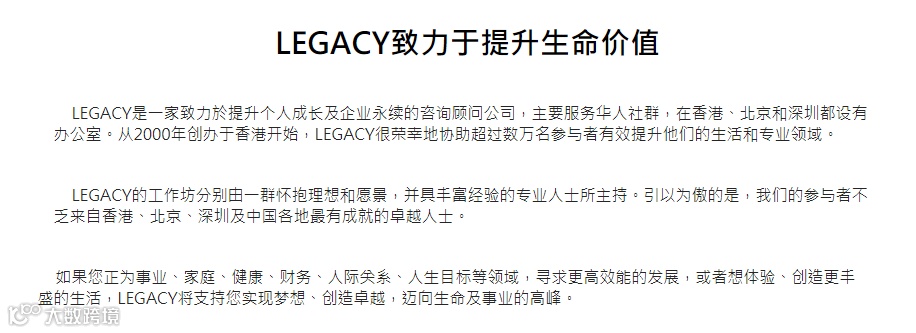 在官网介绍中, LEGACY自称是一家致力于提升个人成长及企业永续的咨询顾问公司,主要服务华人社群,在香港、北京和深圳都设有办公室。其工作坊分别由一群怀抱理想和愿景,并具丰富经验的专业人士所主持,参与者多为香港、北京、深圳及中国各地最有成就的卓越人士。