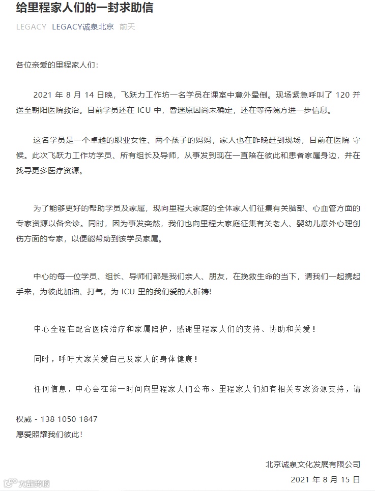 8月15日,LEGACY诚泉北京官方微信号发布一封求助信称,“8月14日晚,飞跃力工作坊一名学员在课室中意外晕倒。现场紧急呼叫了120并送至朝阳医院救治。这名学员是一个卓越的职业女性、两个孩子的妈妈,家人也在昨晚赶到现场,目前在医院守候。为了能够更好的帮助学员及家属,现向里程大家庭的全体家人们征集有关脑部、心血管方面的专家资源以备会诊。”