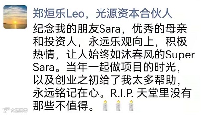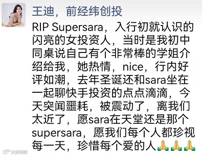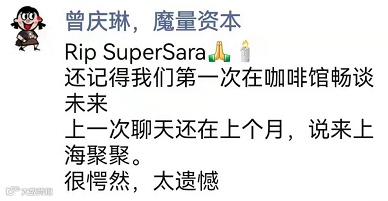 据腾讯新闻《一线》报道,一位熟悉魏萌的投资人表示,魏萌是自己当年同期入行关系最好的朋友,为人处世热情、热爱投资工作,“她绝对对得起Super Sara这个名字”。多位投资人也表示,业内认可魏萌的投资能力,好评颇多,对其突然离世感到可惜和痛心。