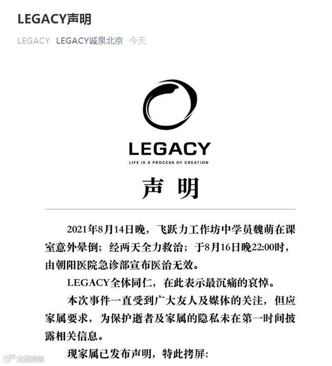 据了解,魏萌是在参加由北京诚泉文化发展有限公司开设的LEGACY工作坊课程的过程中,情绪激动而发生意外。