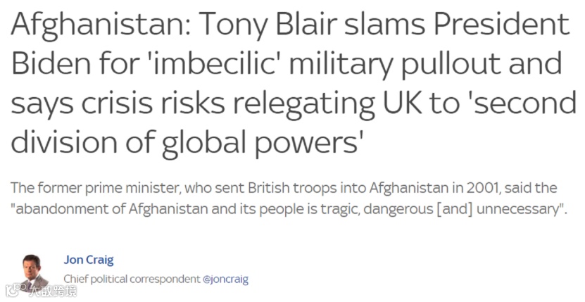 当日晚间,英国前首相布莱尔发表文章称,美国总统拜登在阿富汗的撤军行动“非常愚蠢”。对于美国此次撤军行动,他评论道:“抛弃阿富汗及其人民是悲惨的、危险的、不必要的,不符合他们的利益,也不符合我们的利益。”