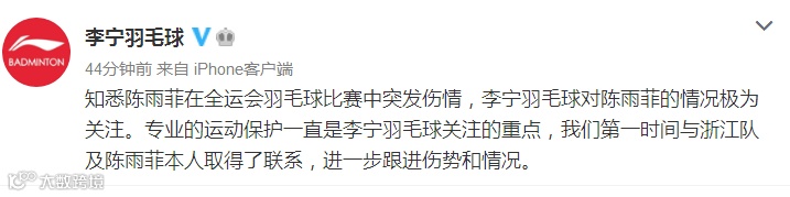 10日,@李宁羽毛球 回应称:知悉陈雨菲在全运会羽毛球比赛中突发伤情,李宁羽毛球对陈雨菲的情况极为关注。专业的运动保护一直是李宁羽毛球关注的重点,我们第一时间与浙江队及陈雨菲本人取得了联系,进一步跟进伤势和情况。