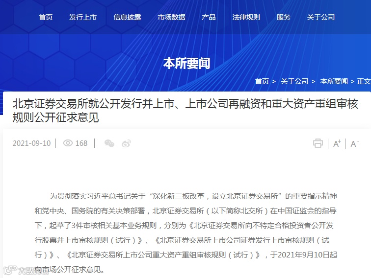 9月10日,北京证券交易所(简称“北交所”)第二批业务规则向市场征求意见,分别为公开发行并上市、上市公司再融资和重大资产重组审核规则,上述三件业务规则吸收借鉴了科创板、创业板试点注册制经验,总结了前期新三板精选层的有关实践,形成了契合创新型中小企业发展规律和需求特点的制度安排。