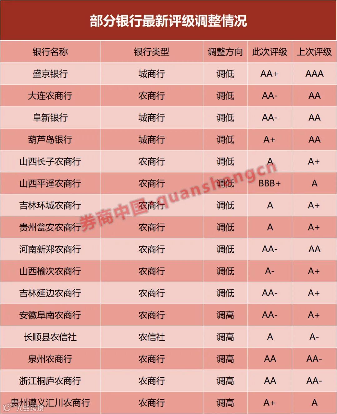 对于城农商行主体及债券评级的调整,有市场分析人士向记者表示,这也是评级机构履职尽责的体现,“一些个别地区的中小银行特别是农商行,资产质量、不良率均有表现堪忧。”他表示,自包商银行被接管之后,各地监管部门也加强了对属地银行系统性风险的排查与管控。”