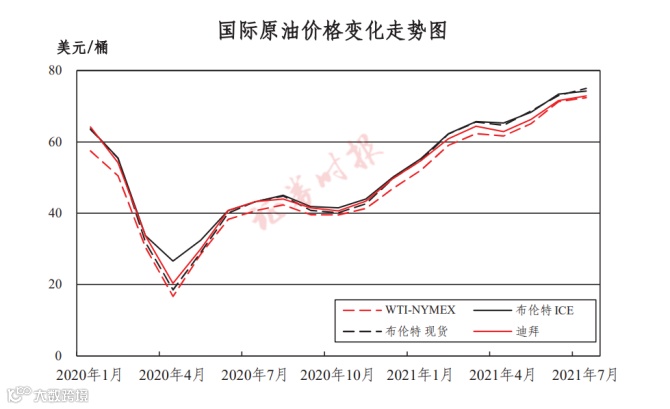 2021年上半年,国际原油价略震荡上行,普氏布伦特原油现货均价为65.23美元/桶,同比上涨62.8%。
