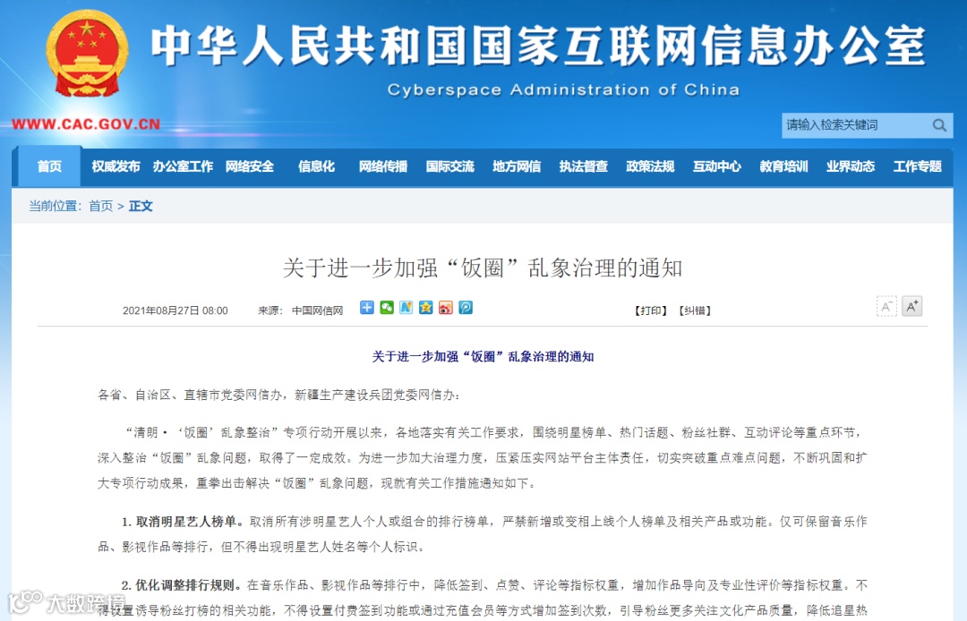 今日,中央网信办发布关于进一步加强“饭圈”乱象治理的通知,要求:①取消明星艺人榜单;②优化调整排行规则;③严管明星经纪公司;④规范粉丝群体账号;⑤严禁呈现互撕信息;⑥清理违规群组版块。⑦不得诱导粉丝消费;8严控未成年人参与;9强化节目设置管理。10规范应援集资行为。