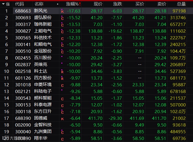 值得注意的是,有一个热门赛道今天突然崩了,那就是储能。今天,储能板块集体杀跌,科士达、百川股份、英维克先后触及跌停,上能电气、盛弘股份跌超10%。