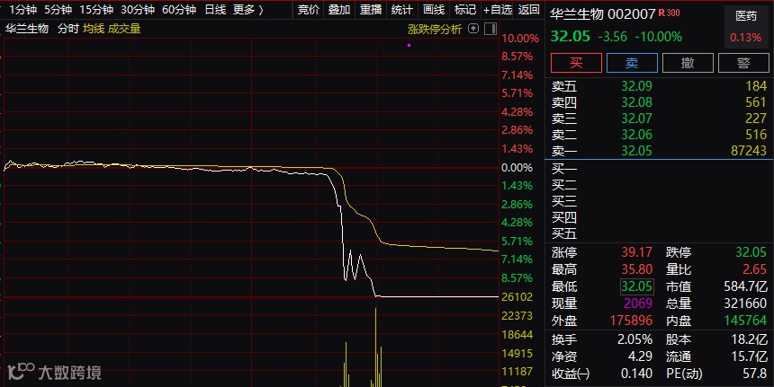 首先,来看华兰生物。该股属于机构重仓股,截至上半年,有32家机构持有该股。今天下午,该股突然闪崩跌停。