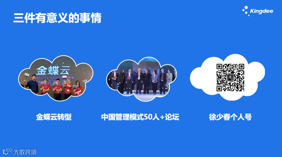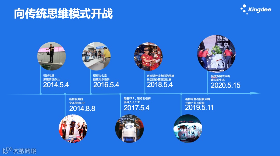给大家分享我如何突破数字化瓶颈。我2014年开始“砸”,2014年5月4日,我砸掉了笔记本电脑,凭一部手机移动办公;2014年8月8日,我砸掉了客户的服务器,我说一定要到云上来;2016年5月4日,我砸掉了办公室;2017年5月4日,我砸掉了ERP;2018年5月4日,我砸掉了财务和业务的围墙,财务就是业务,业务就是财务,本来就是一体化;2019年5月11日,我把束缚我的“茧”给砸掉了;今年5月15号,我砸掉了一个“旧烟囱”。这样做是告诉金蝶全体员工,必须向传统思维开战,只有不断变革才能获得新生。所以,数字化转型其实很大程度上就是思维模式的转型,首先就要突破自己的思维模式。