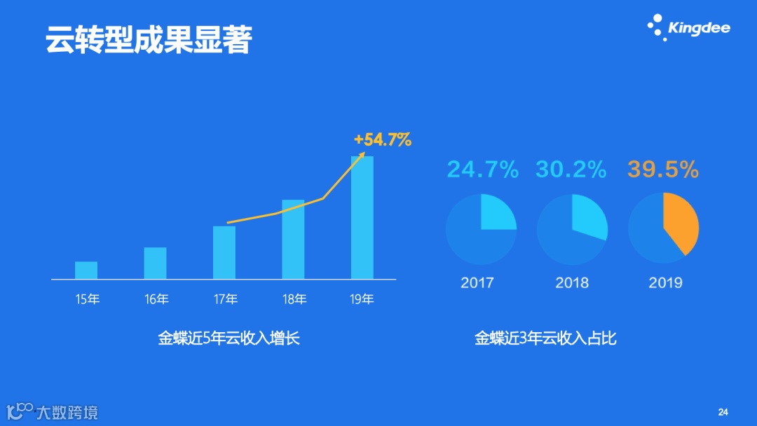 第一,金蝶的云转型。在2014年,金蝶的云收入占比是0,但是到去年底已经占到了39%,让一个传统软件公司正在变成云服务公司,其实突破了数字化成长瓶颈。