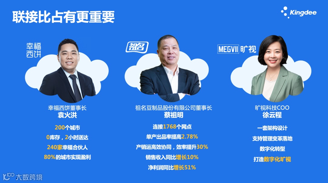 数字化转型的另一个体会,联接比占有更重要。在过去,金蝶的三个客户进行了很成功的数字化转型:幸福西饼,数字化转型以后,进入了一个新零售,在200个城市实现了零库存,生鲜两小时送达;祖名豆制品,简单的豆制品营业额超过了10个亿,连接了1768个网点,单产出品率提高了2.78%;旷视科技,通过大数据、视频技术,能够精准地识别人,依托架构实施管理变革落地。不止这三家企业,还有很多杰出的企业在各方面进行了数字化的探索。金蝶本身也伴随着他们的成长,一路提供各种产品和解决方案,从小微企业到中型企业,到大企业。金蝶坚持为企业成长而生,这也是我们的理念。