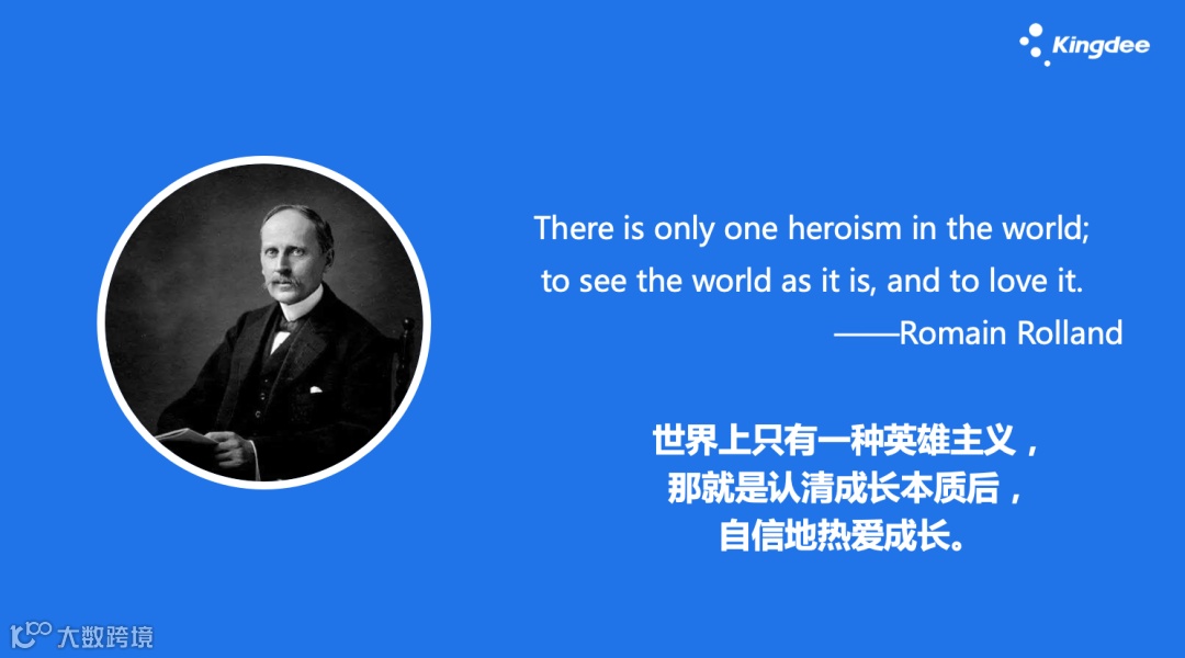 最后我借用罗曼•罗兰这句话来结束演讲——这个世界上只有一种英雄主义,当你认识了世界的本质、生活的本质以后,你还会热爱生活。我把它做了一个修订,那就是世界上只有一种英雄主义,那就是认清成长本质后,自信地热爱成长。