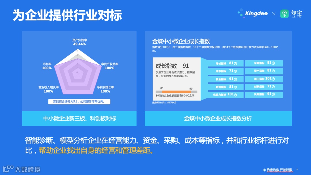 金蝶也提供了大数据的行业对标,在金蝶产品精斗云里,有金蝶的大数据为中小企业进行对标。我们研发了一个中小微企业成长指数,根据这个指数就知道你的企业处在何种位置,还有什么样的差距,应该怎么样努力等等。