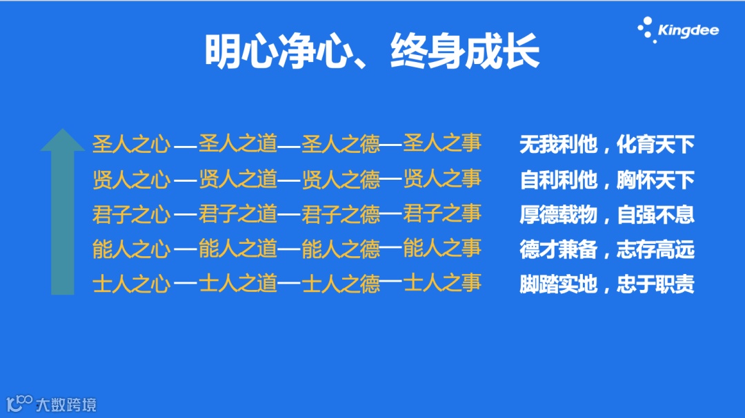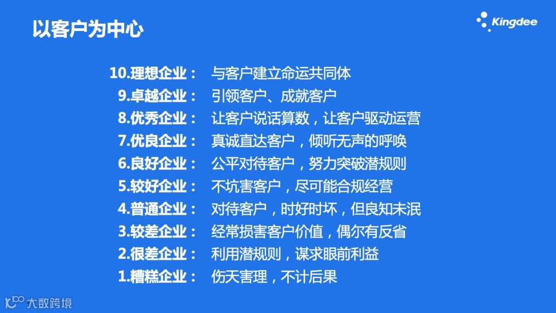 我再举个例子,心性决定我们对客户的态度。每一个企业都在以客户为中心,但是以客户为中心有10个台阶,你处在什么样的台阶呢?两年前,我开设徐少春个人号,其实我想做的一件事情就是让客户说话算数,让客户驱动运营,其实就是以客户为中心是最好的评判,如果要激励员工,就让客户来激励员工,所以金蝶本身还在朝向一个追求优秀的道路上前进,但是我们的目标不止于此,我们要从优秀走向卓越。