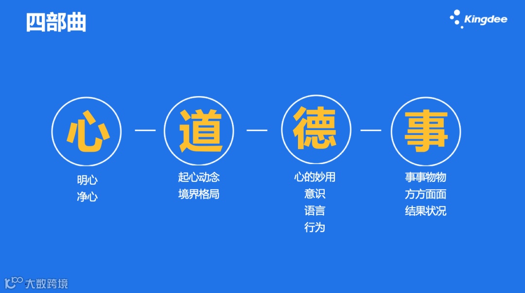 这几年,我通过学习中华圣贤文化,了解到四部曲这样一个哲学路径。所有中小微企业领导者可以体悟,四部曲就四个字:“心-道-德-事”。遇到瓶颈如果只在事上用功,收效甚微。比方说数字化转型遇到困难了,系统遇到问题了,你在这个事情上用功是收效甚微的。但是如果你在德上用功,那就是收效颇丰,什么是“德”呢?德就是我们心中的仁爱、智慧、胸怀和勇气。为什么过去几年我要砸东西?其实是在我内心深处,觉得我要为客户提供更大的价值,必须以一种创新的技术来替代,所以我心中一定要燃起对客户更深深的爱。所以,拥有了仁爱、智慧、胸怀、勇气,当遇到困难了,如果在“德”上用功,困难就迎刃而解了。如果在他人生遇到瓶颈的时候突然顿悟产生了智慧,认知瓶颈就突破了,在德上用功收效颇丰。