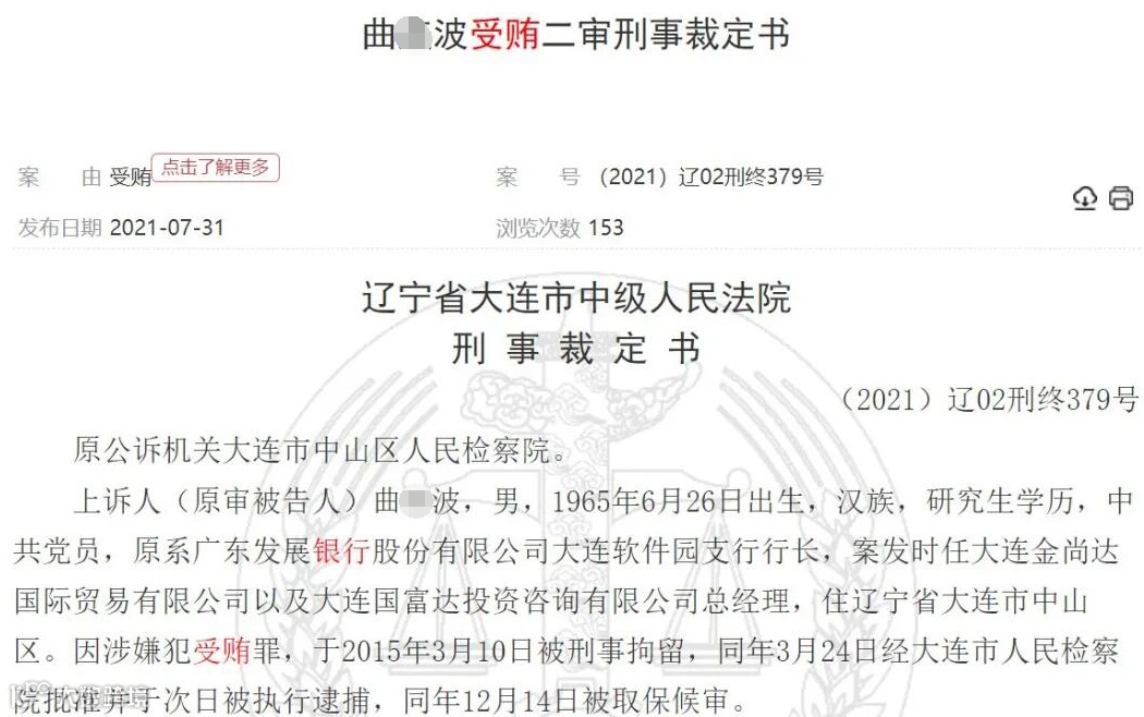 裁判文书网近期披露的一则刑事裁定书显示,2015年3月10日,广发银行大连软件园支行原行长曲某波因一封举报信被刑事拘留,而这名举报者正是向曲某波行贿之人刘某。