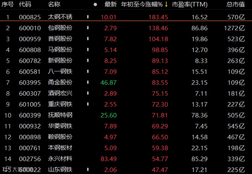 在钢铁板块中,太钢不锈涨幅最大,年初至今涨幅达到183.15%,其次是包钢股份,涨幅达到138.46%。