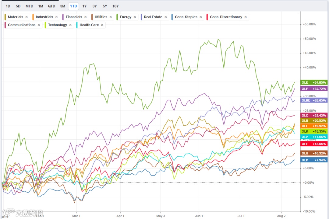 数据显示,在申万所属的28个一级行业中,钢铁板块年初迄今涨幅48.92%,排名第一。而同样情况在美国市场上也在上演。在标普500指数11大板块中,能源板块跑赢第一。