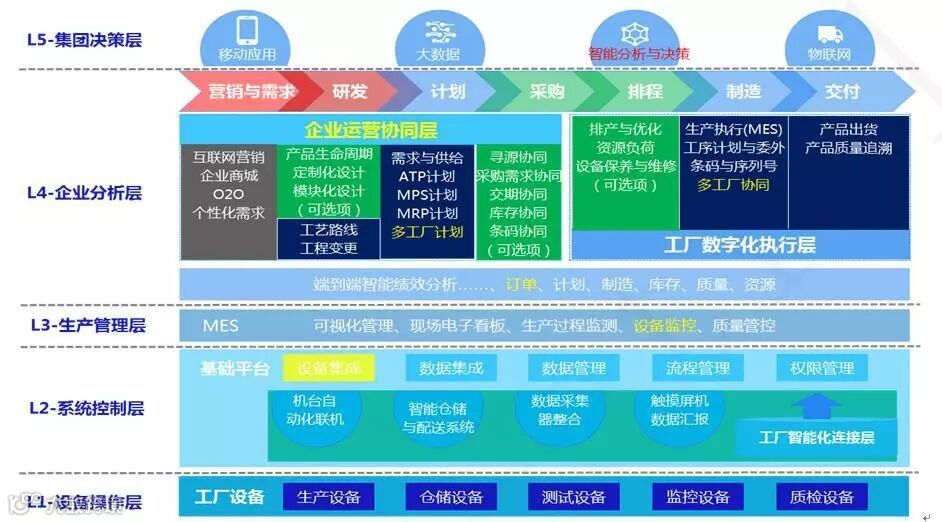 同时,也体现了不同的系统在不同业务运营中的分工。传统的信息系统只注重四级和五级应用,没有实现与设备的连接。金蝶云·星空智慧工厂解决方案框架的关键是提出了“ERP+MES一体化”的解决方案,可以为制造企业积累生产现场的工艺、质量、设备等方面的实时数据。从而满足多品种、小批量、定制化生产,并且极大地缩短制造企业的生产交期;提供可追溯的品质管理(特别是对医药食品行业);降低企业的人工成本,从而适应我国人工成本快速上升的趋势,构建面向全球的企业竞争力。